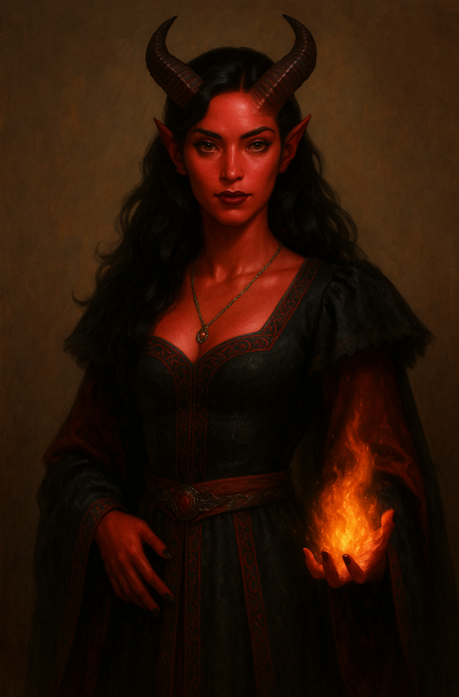 Azira é uma tiefling de pele vermelha vívida, quase incandescente quando sob luz arcana. Seus olhos são de um dourado inquietante, como brasas vivas que raramente piscam. O cabelo é longo, escuro como fuligem de carvão, caindo em ondas densas sobre os ombros. Usa roupas nobres — veludo negro com detalhes carmesim costurados com prata — que equilibram elegância e ameaça. Seus chifres curvados para trás são polidos e adornados com pequenos anéis metálicos que tilintam quando ela conjura magia. Sua beleza é arrebatadora e impossível de ignorar.