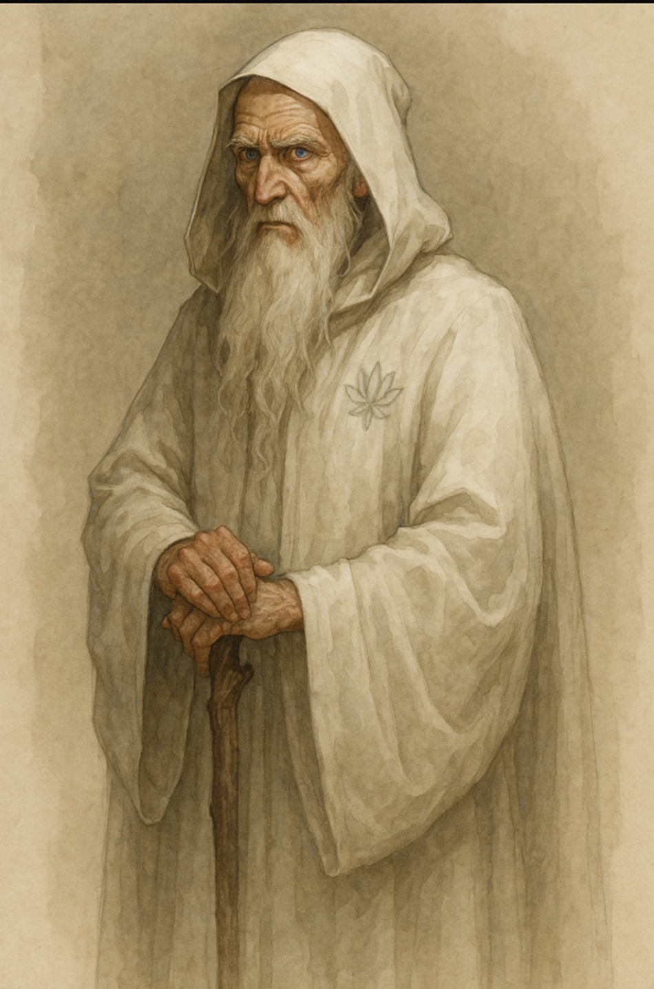 Eldoran é um humano extremamente idoso — tão velho que sua idade é dita ultrapassar facilmente os cento e cinquenta anos. A pele é fina como pergaminho, marcada por rugas profundas que parecem mapear as guerras que viveu. Seus cabelos são longos, brancos como neve antiga, presos em uma trança que toca o meio das costas. Os olhos, porém, são o que o tornam inconfundível: um azul-pálido brilhante que parece carregar relâmpagos internos, um presente herdado da antiga bênção dracônica da Lótus. Caminha curvado, apoiado em um cajado torto coberto de pétalas de lótus secas — mas seus passos nunca vacilam.