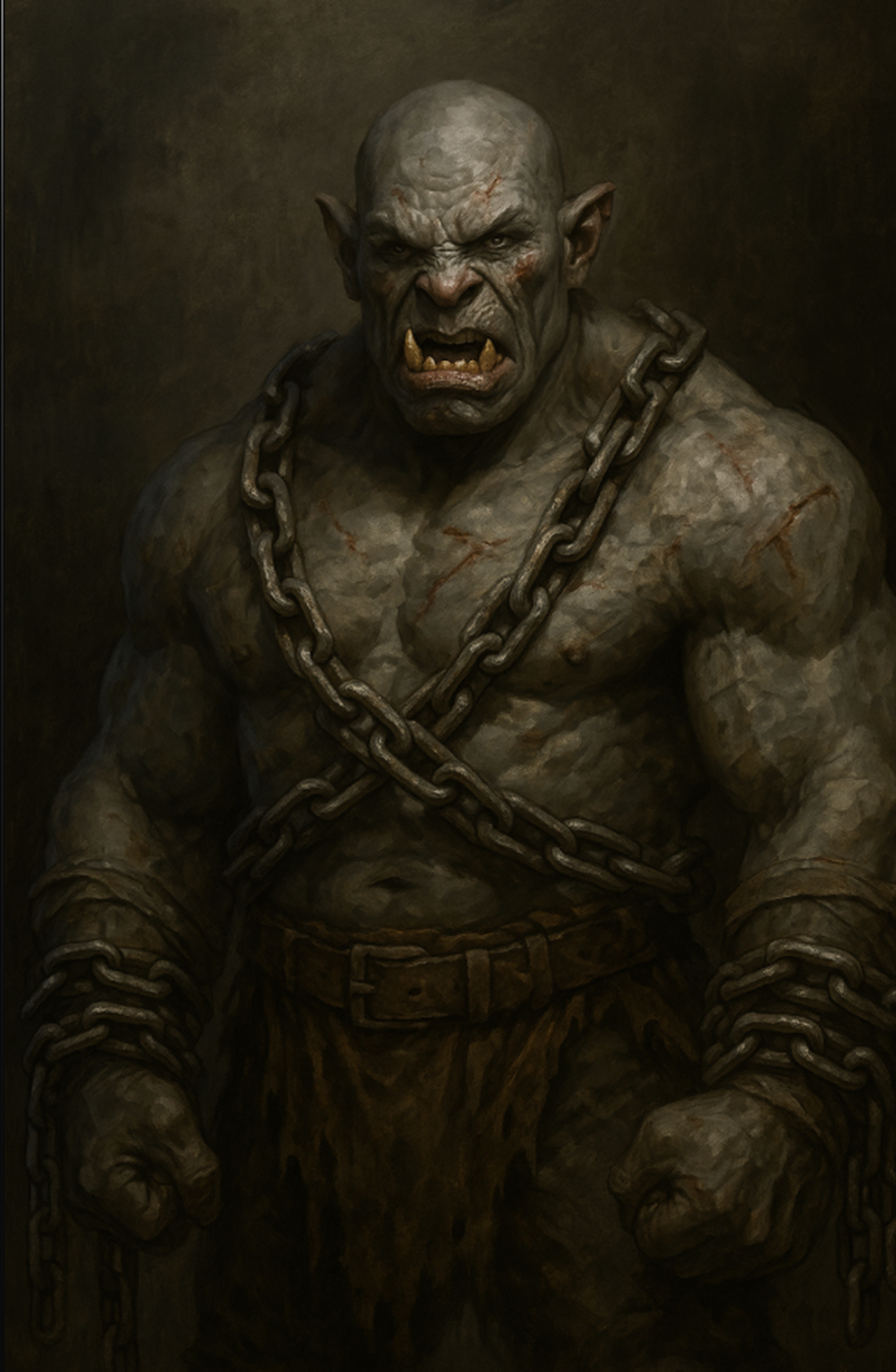 Kruld é um orc de pele acinzentada e corpo colossal, com músculos densos e cobertos de cicatrizes antigas. Sua boca é marcada por cortes profundos, e vários de seus dentes foram quebrados em lutas passadas, deixando o sorriso dele mais assustador do que feroz. As orelhas são rasgadas, e o nariz já foi quebrado tantas vezes que parece torto e achatado. Veste apenas calças de couro grosso e faixas nos pés, exibindo braços envoltos por pesadas correntes de ferro, usadas tanto como arma quanto como símbolo de sua brutalidade.