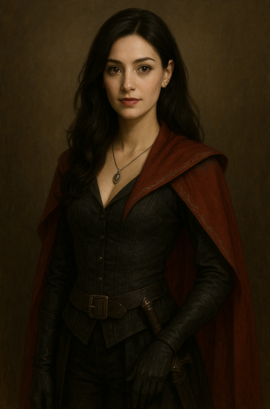 Ela veste roupas nobres e funcionais: um corset preto reforçado, luvas longas de couro fino, calças ajustadas e uma capa curta carmesim com detalhes prateados — as cores dos Punhos de Aço. Carrega adagas curvas ocultas em diversos pontos do traje, além de anéis e pingentes com runas antigas que potencializam seus encantos.