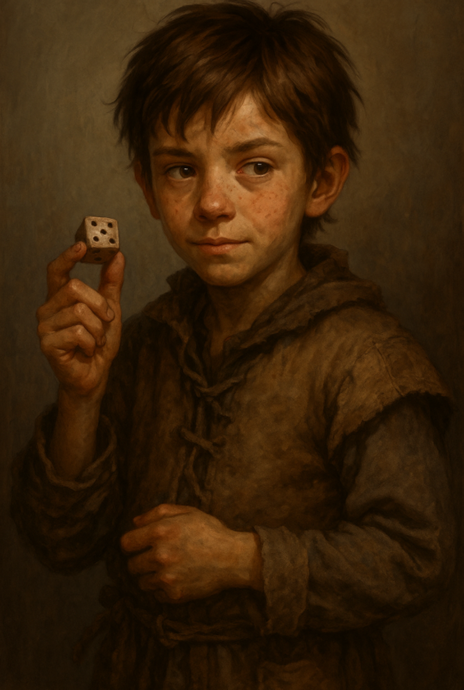 Lorien é um garoto humano magro, cerca de 14 anos, pele clara marcada por poeira e carvão — resultado de passar os dias entre becos, tavernas abafadas e vielas próximas às forjas. Tem cabelos castanhos desgrenhados, cortados de maneira irregular com uma adaga velha, e olhos espertos demais para a pouca idade. Usa roupas remendadas, com bolsos costurados à mão e esburacados de tanto carregar dados, moedas e pequenos objetos. Move-se rápido, com a postura tensa de quem está sempre pronto para correr.
