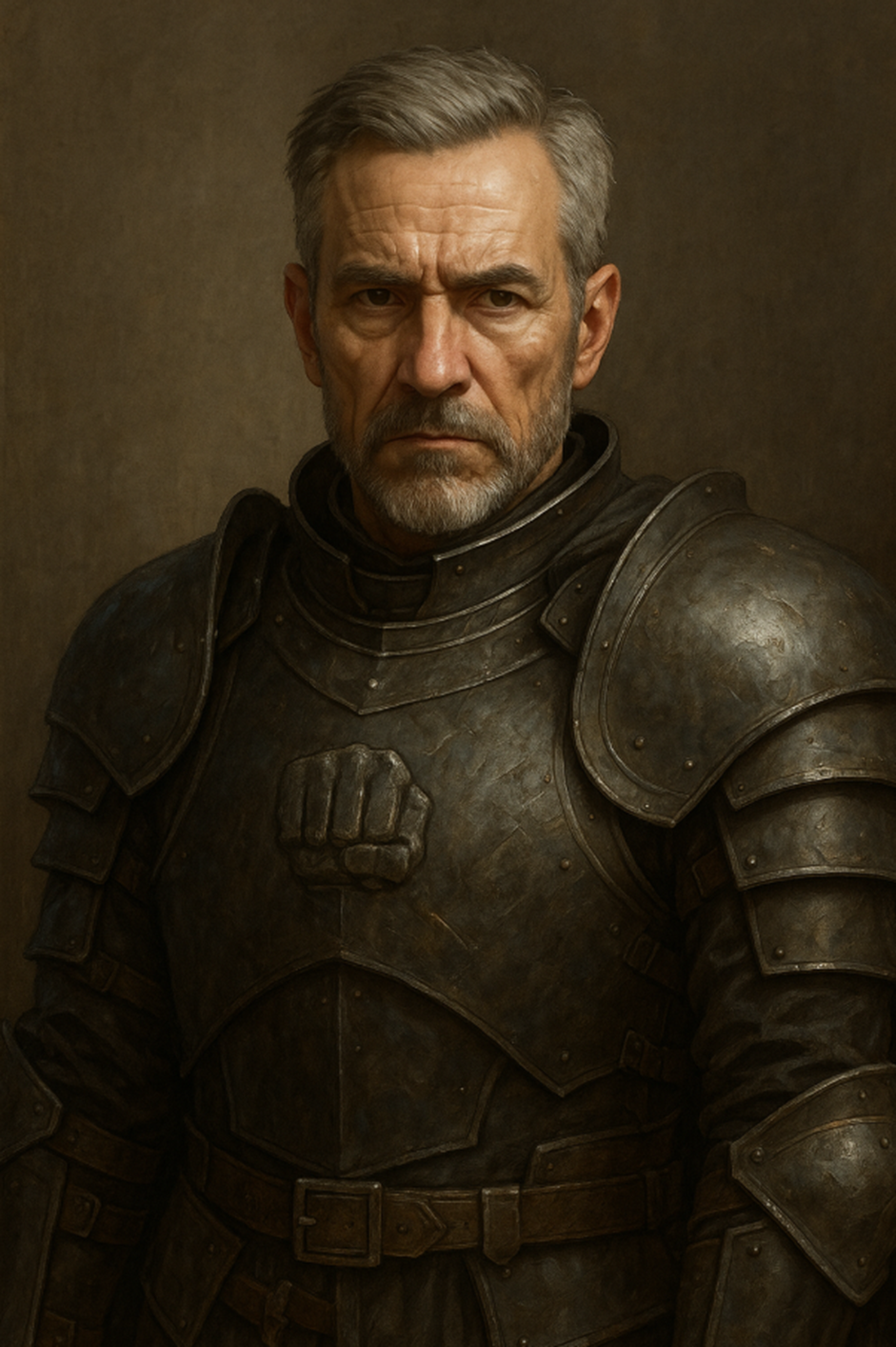 Malrick Kaelthorn é um homem humano alto, de porte rígido e presença esmagadora. Seus cabelos são grisalhos, curtos e sempre bem alinhados. O rosto carrega cicatrizes antigas — não de batalhas heroicas, mas de sobrevivência. Seus olhos são castanho-escuros, fundos e cansados, como alguém que já viu o mundo acabar mais de uma vez. Ele veste uma armadura negra refinada, sem exageros, sem ornamentos — apenas funcionalidade absoluta. No peito, o símbolo dos Punhos de Aço, gasto pelo tempo, não reluz: impõe.