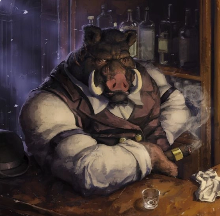Rukhar é um imenso híbrido de homem e javali, com corpo musculoso e pesado, sempre vestido em roupas elegantes demais para o esgoto: colete de couro escuro, camisa branca justa nos braços e um relógio de bolso preso ao cinto. Seu rosto é dominado pelo focinho achatado e pelas presas enormes, amareladas pelo tempo. Os olhos pequenos e fundos brilham de astúcia, e seu hálito mistura fumaça de charuto com cheiro de álcool forte. Atrás dele, sempre há uma mesa coberta de fichas, moedas e papéis de aposta.